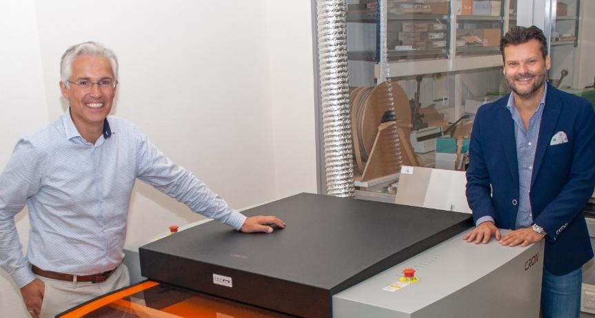 Foto: Bram Dekker (links) en Patrick Hoeve van AtéCé bij de nieuwe volautomatische Cron belichter bij Dekker Creatieve Media & Druk.