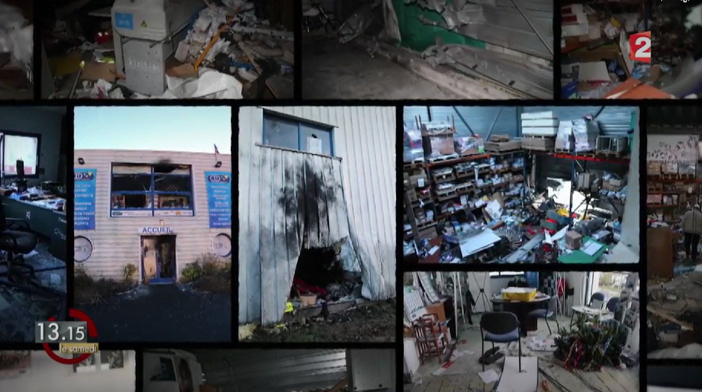 De trieste staat van de drukkerij na het vuurgevecht van de gijzelnemers met de politie, in beeld bij France 2.