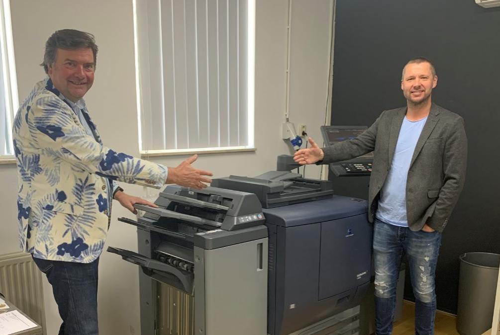 Bart Klaasen, senior accountmanager bij Konica Minolta (links op de foto): ‘ Mooi om te zien dat ondernemers nog bereid zijn te investeren in deze lastige periode. Wij wensen Boudewijn Maas heel veel succes met zijn nieuwe Konica Minolta AccurioPress C3070.’
