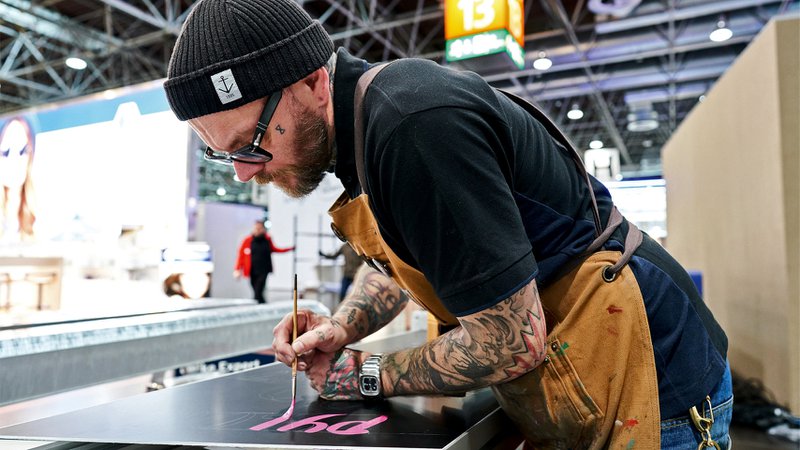 ‘Er is vooral veel vraag naar vintage,’ zegt Frank Chaki. De getatoeëerde verschijning staat op een signbeurs…